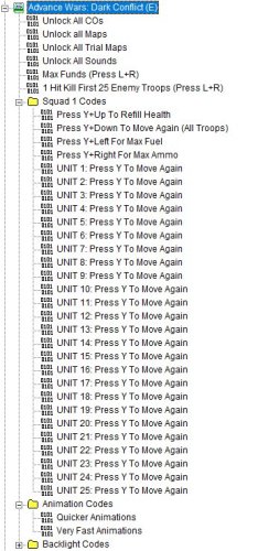 Cette liste de codes a été testée avec la version Europe de Advance Wars Dark Conflict sur DS. Cependant, il est possible que ces cheat codes fonctionnent aussi avec les autres versions du jeu.