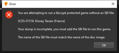 Quand je lance le jeu sans fichier sbi avec l’émulateur Duckstation, j’obtiens ce message d’erreur :
