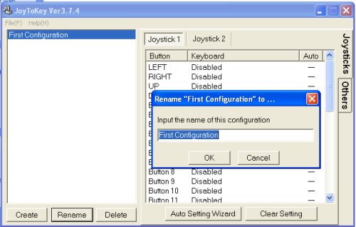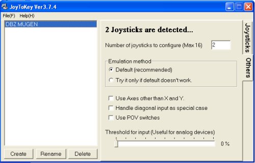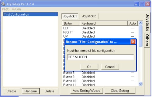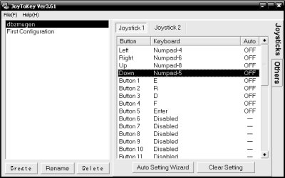 A noter que quand vous fermer JoyToKey, il enregistre automatiquement votre configuration dans un fichier .cfg. Ainsi si vous regarder votre dossier JoyToKey aprés configuration, vous apercevrez que 2 fichiers.cfg sont apparus : Celui de la configuration par default (First Configuration) et celui que vous créé (DBZMUGEN). Si vous supprimer ce dernier, il vous faudra tout recommencer.