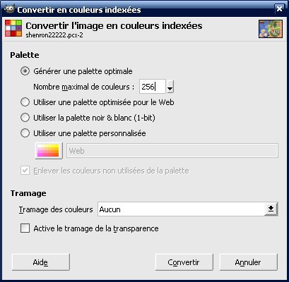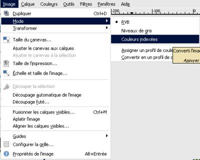 Dans cette fenêtre justement, allez dans le menu "Image", puis "Mode" et sélectionnez "Couleurs Indexées".